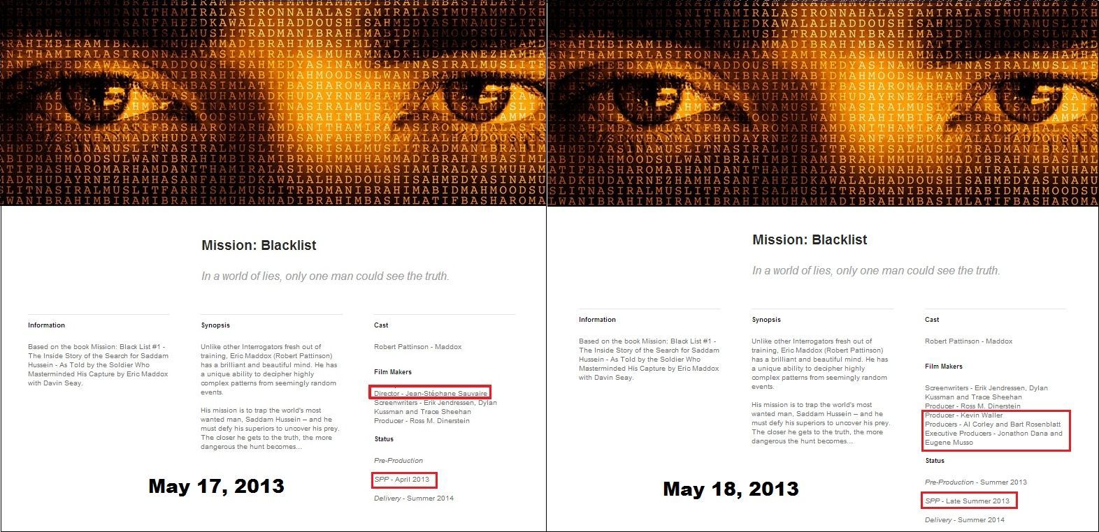 Embankment Films atualizou sua página do projeto “Mission: Blacklist” retornando novamente ao seu estado anterior. O diretor novamente não está listado juntamente com Início da Fotografia Inicial (SPP), retornando ao seu estado anterior – Ao final do verão. Kevin Waller foi adicionado à lista de Produtor novamente junto às novas adições Al Corley e Bart Rosenblatt.